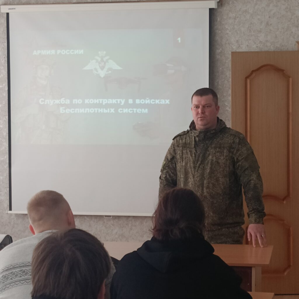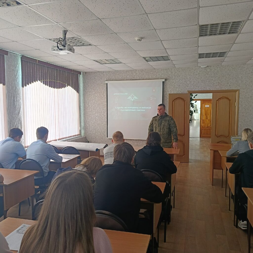 11 марта 2026 года состоялась встреча инструктора пункта отбора на военную службу по контракту г. Курска сержанта Кругляк И.Е. со студентами группы выпускного четвертого курса по вопросу поступления на военную службу по контракту в войска беспилотных систем Вооруженных Сил Российской Федерации. В ходе беседы обсудили требования к кандидатам для поступления на военную службу по контракту, особое внимание обратили на социальные льготы и гарантии, предоставляемые военнослужащим по контракту в войсках беспилотных систем. Встреча вызвала у студентов интерес и вопросы, на которые они получили развернутые ответы.