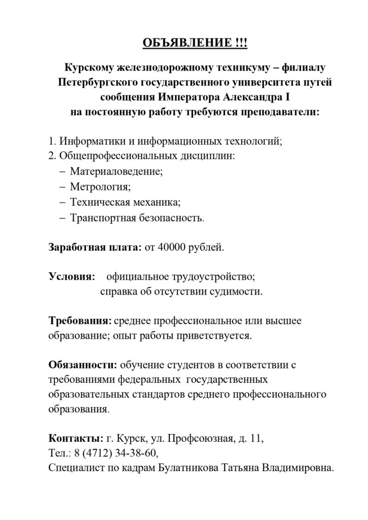 Курский железнодорожный техникум – филиал федерального государственного бюджетного образовательного учреждения высшего образования "Петербургский государственный университет путей сообщения Императора Александра I" в г. Курск