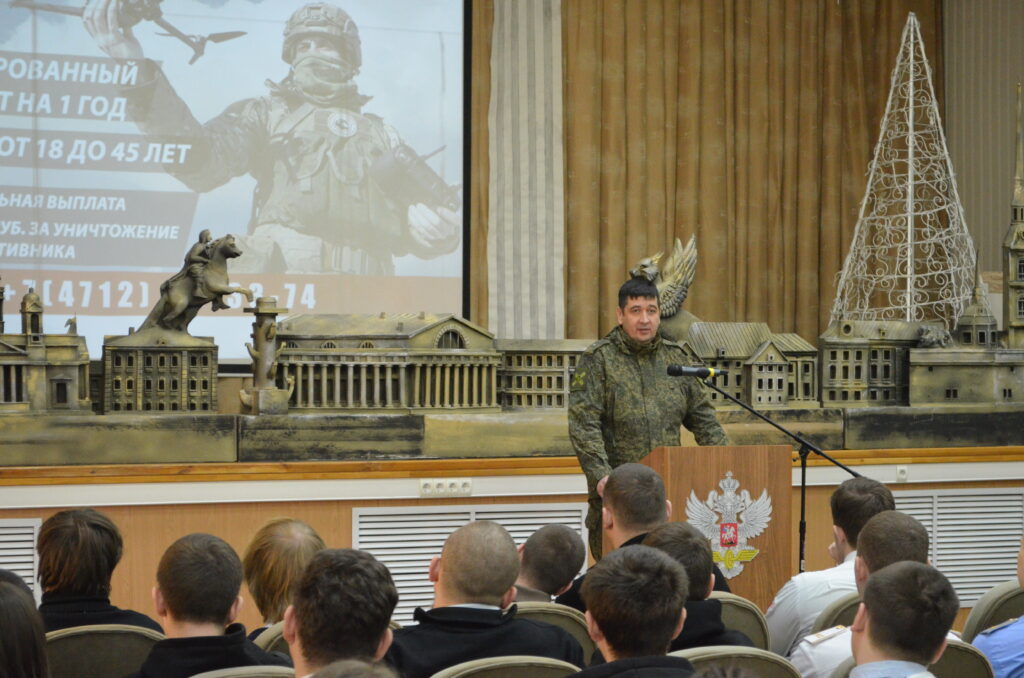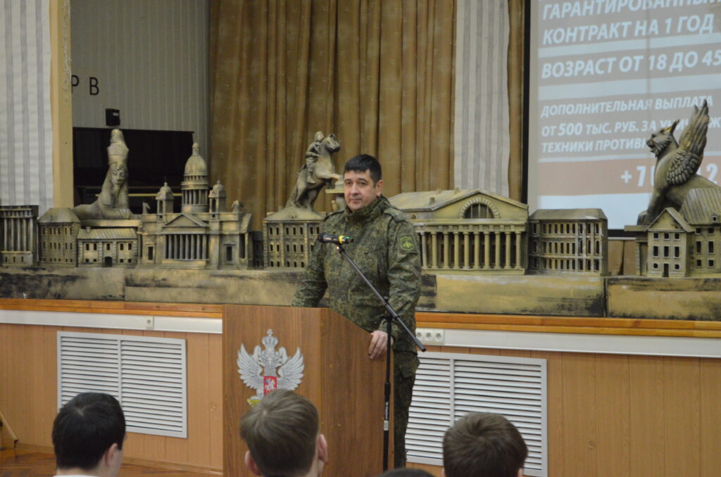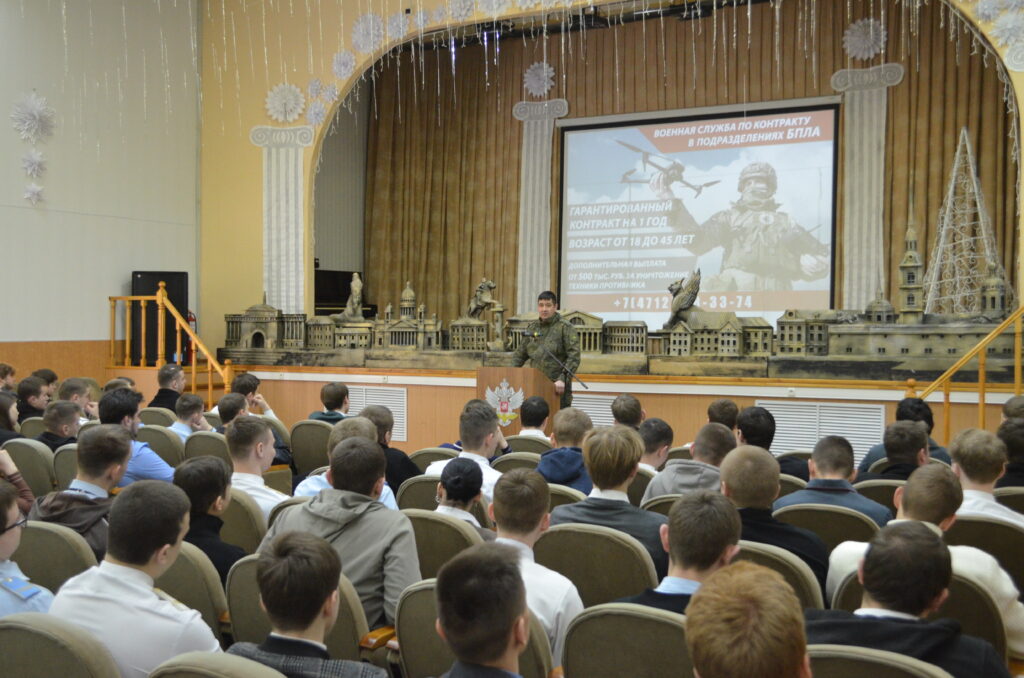11 февраля 2026 г. в Курском железнодорожном техникуме состоялась встреча заместителя начальника пункта отбора на военную службу по контракту (1 разряда) г. Курска майора Калмыкова Эдуарда Александровича с обучающимися 3 и 4 курсов.