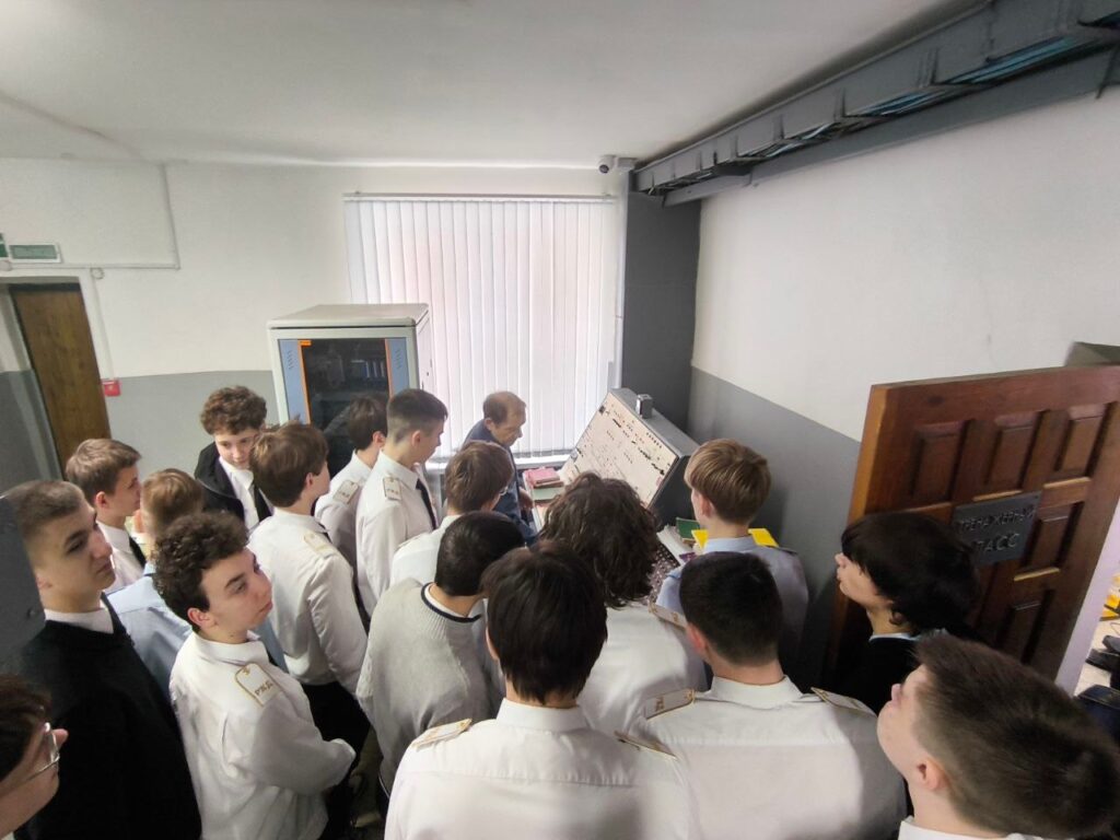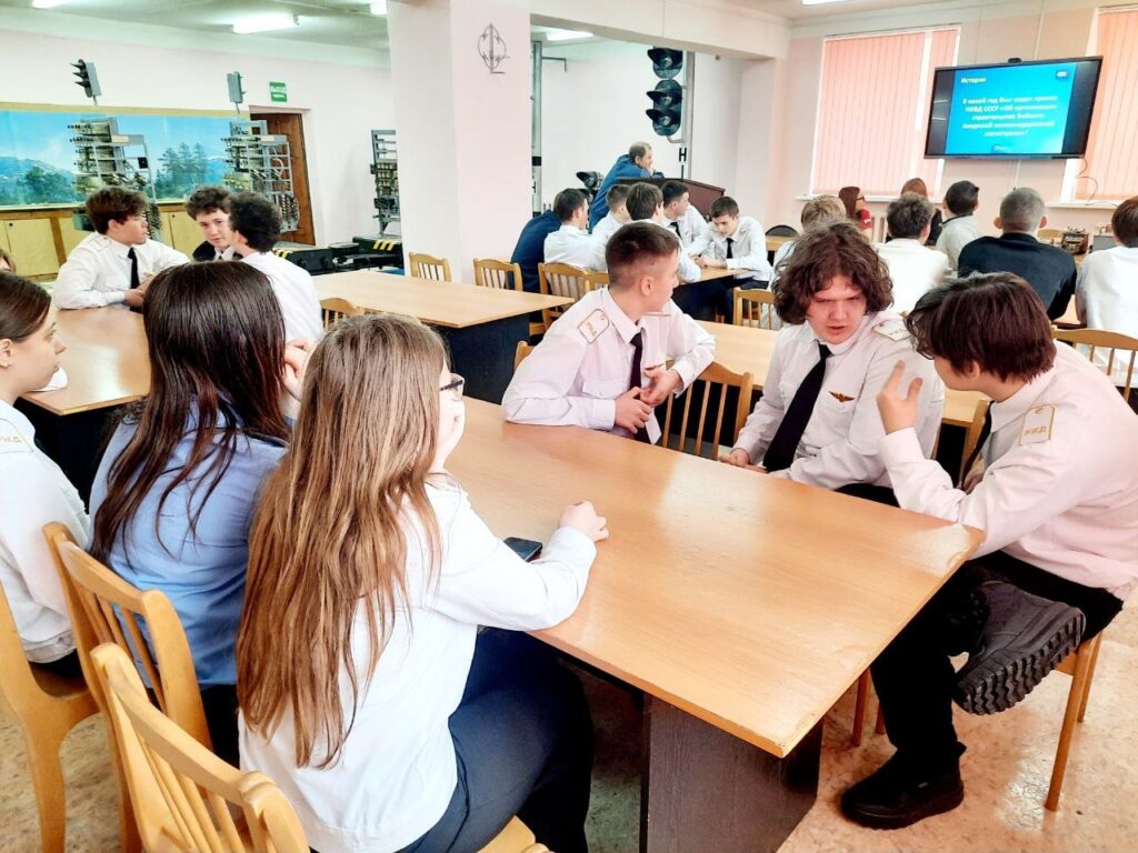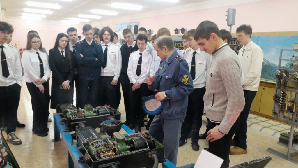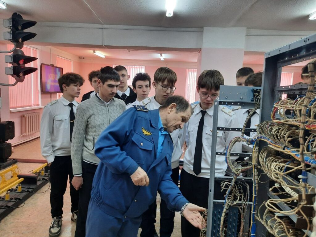 Следующим этапом стал познавательный урок в техническом кабинете, проведённый заслуженным работником транспорта, Почётным железнодорожником Владимиром Егоровичем Грешиловым. Студенты увидели настоящие действующие устройства, применяемые на производстве, узнали, как электромеханики учатся находить неисправности и устранять неполадки; как выглядит релейная комната, пульт-табло ДСП, электропривод, мачтовые и карликовые светофоры, релейные шкаф.