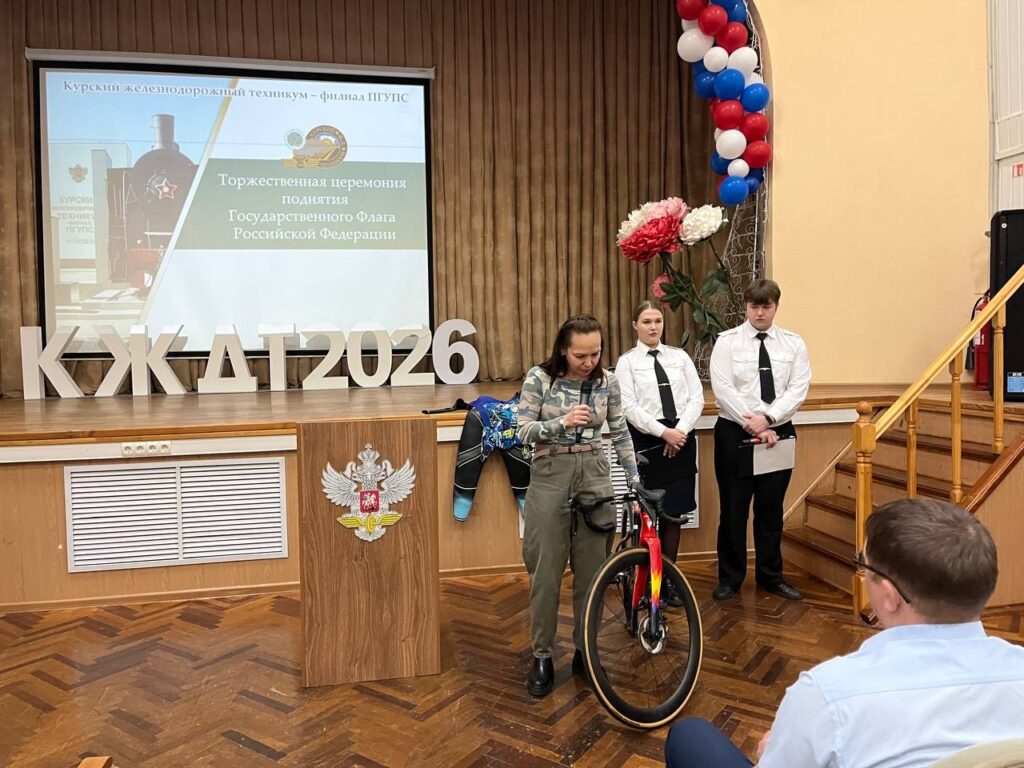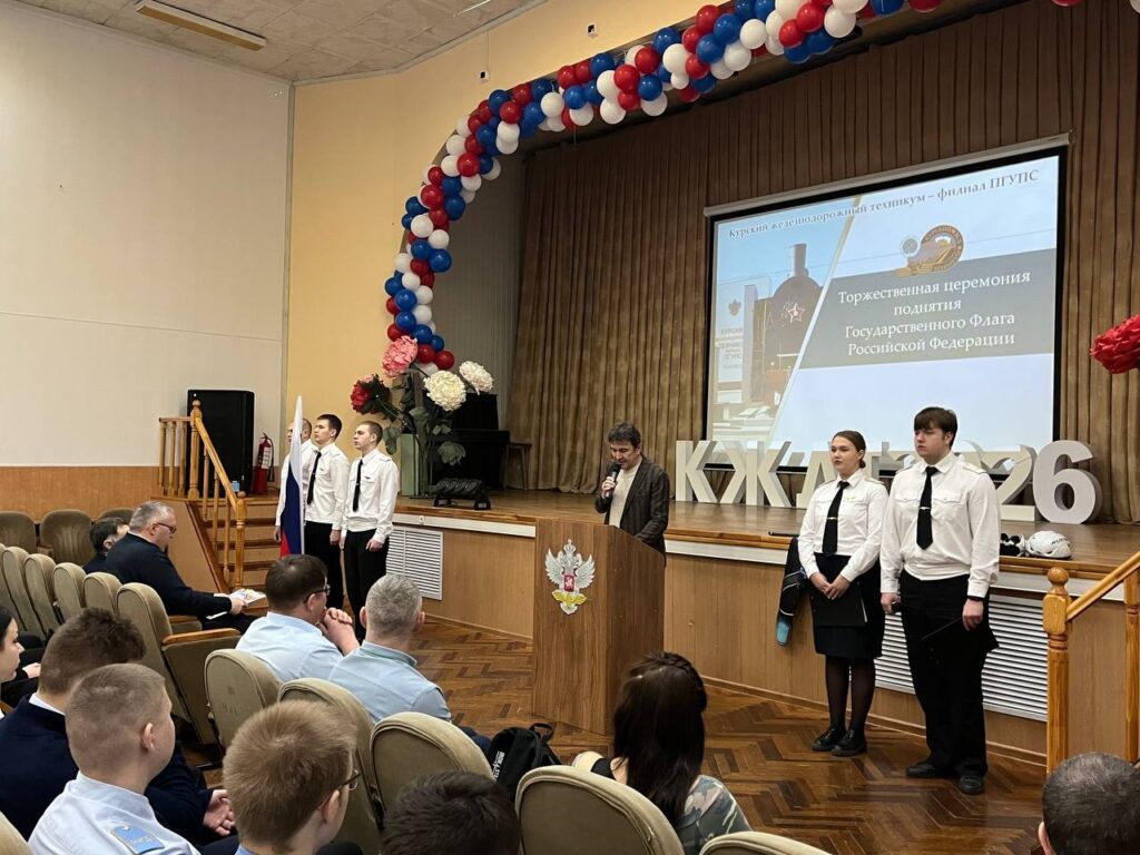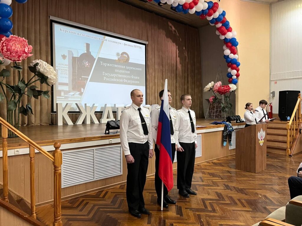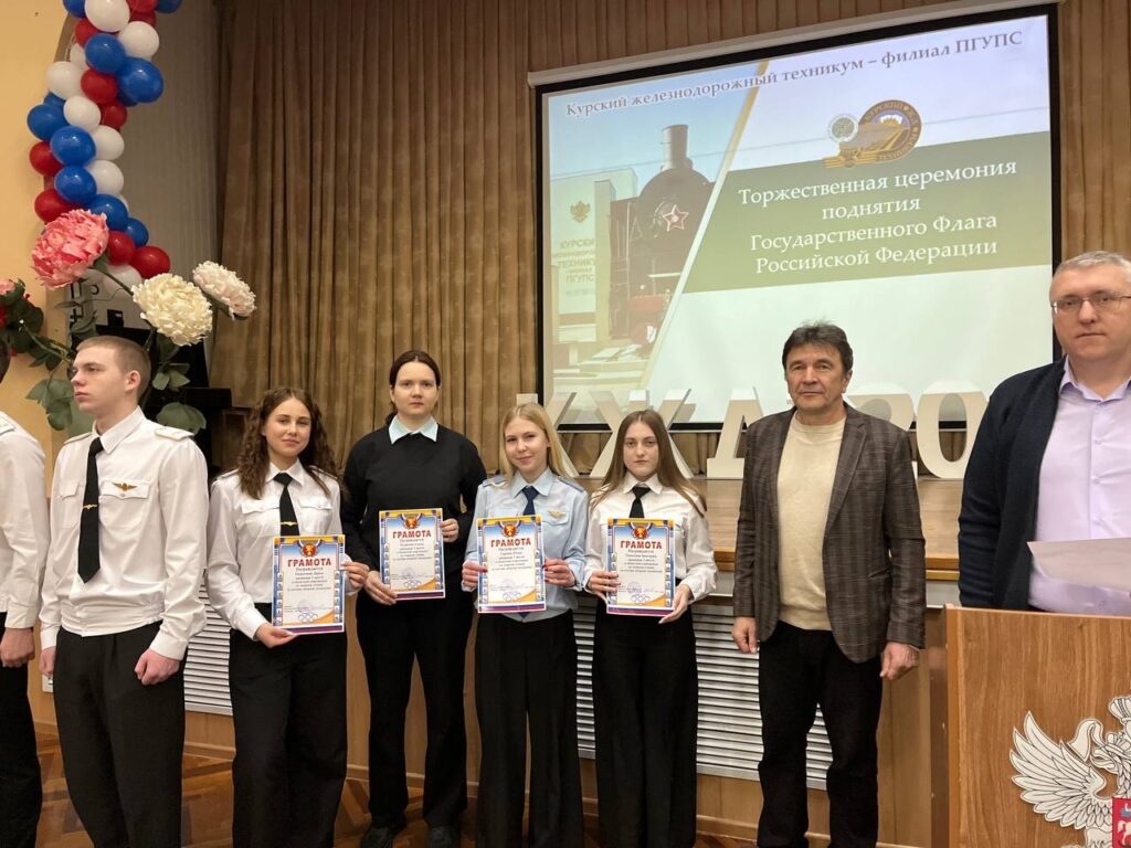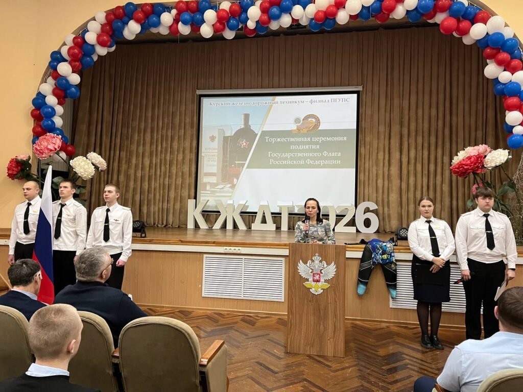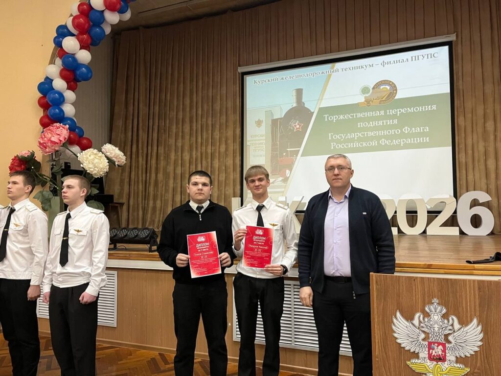 10 марта 2026 года учебная неделя в Курском железнодорожном техникуме – филиале ПГУПС началась с торжественной церемонии поднятия государственного флага Российской Федерации. Право поднять государственный флаг Российской Федерации было предоставлено студентам 3 курса отделения Строительство железных дорог, путь и путевое хозяйство Рыкову Кириллу, Калашникову Родиону, Кутепову Александру.
